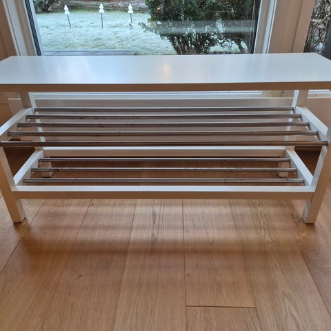 Praktisk og stilfull skohylle med benk. Har en liten flekk på puten, som sikkert kan rengjøres (se bildet)