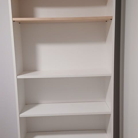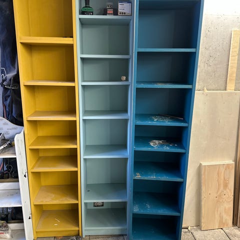 Tre halvhyller i Billyform, har vore brukt til DVDar og bøker.