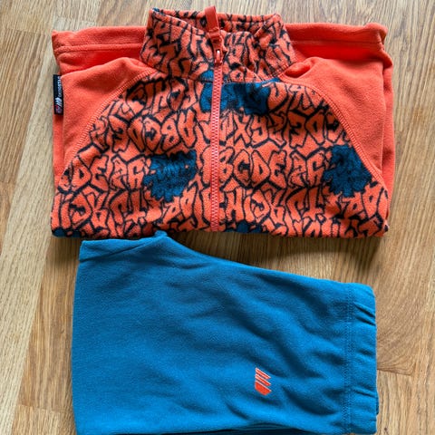 Vinterdress. Har feste for strikk på beina, men ingen strikk. Avtakbar hette. Strikk i livet.