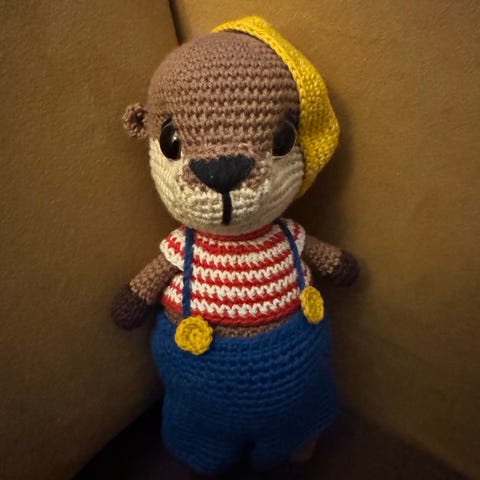 Heklet bamse med klær. Kan også hekle bamse på bestilling hvis ønskelig.