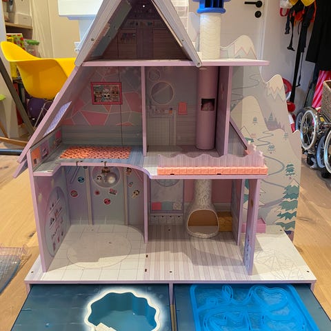 LOL dukkehus med flere etasjer, inkludert spiralrutsjebane og møbler. Passer for barn som liker rollelek med dukker.