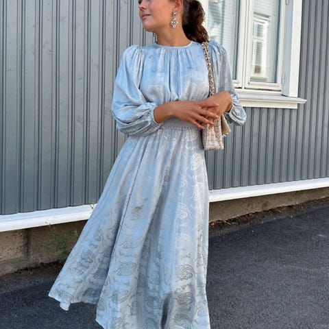 Pent brukt By Timo kjole - Twisted Midi dress i mønsteret Elephant blue. En veldig behagelig og romslig kjole. Den er luftig, og helt perfekt for varme sommerdager - eller vårdager. Passer fint til både hverdag og fest.