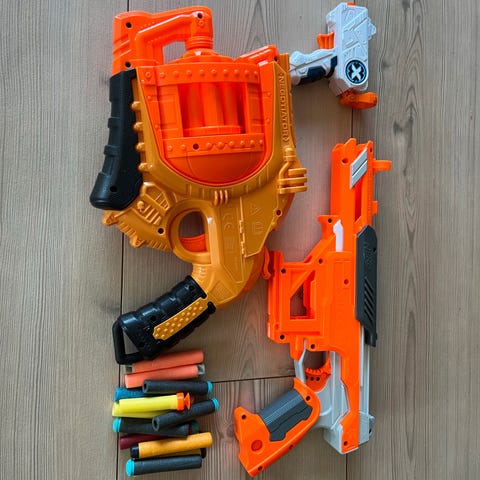 Flere typer nerf-pistoler (og lignende) med tilbehør og skumkuler. Alle pistolene er brukt, men de er alle funksjonelle og i god tilstand. Noe synlig slitasje på flere av dem.