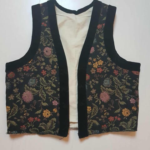 Lite brukt vest til sognebunad i nydelig gyllen og blomstrete silkebrokade. Vesten er ca i 38. Men siden den er demontert nå, kan den lett tilpasses andre str. Stoffet kan også brukes som silkebrokade til andre prosjekter😊