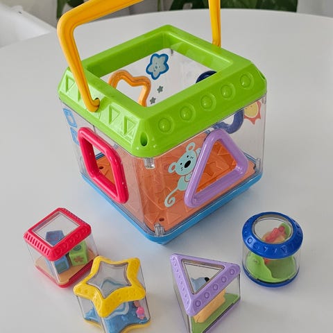En klassisk aktivitetsleke til de aller minste, fra Fisher-Price. Dette fargerike settet besår av ti klosser i ulike former og farger, og en bøtte med avtakbart lokk. Barnet lærer seg å kjenne igjen og matche former, samtidig som hen utvikler koordinasjonen sin. Med tiden kan barnet også bruke klossene til å lære seg farger og å regne.