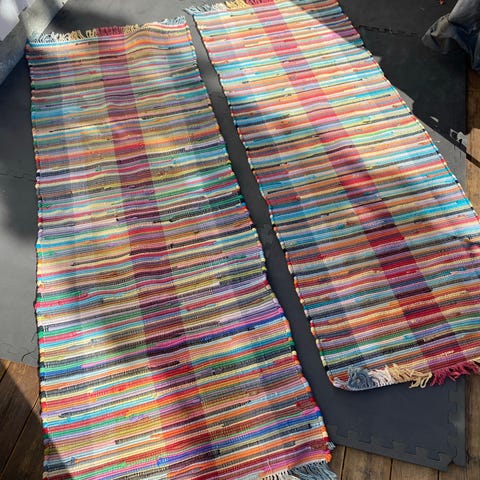2 stykk henvende fargerike matter. Framstår som ubrukt. Mål 340 lang,260 lang bredde75 . Selges helst samlet. Sendes mot porto