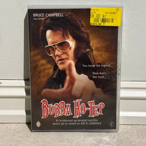 Bubba Ho-Tep film med bilde av Bruce Campbell og Ossie Davis. Coveret har et retrodesign med varme farger og viser hovedkarakteren i midten iført solbriller.