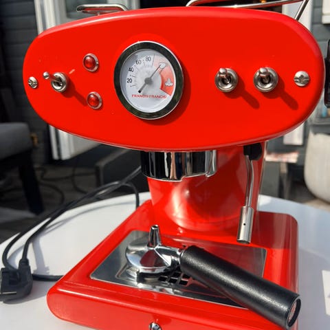 Maskinen har et retro design med metalliske detaljer og en portafilter for enkel tilberedning av espresso. Egnet for hjemmebruk. Integrert steamer for varming av melk.