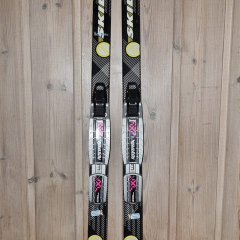 Enkle og greie langrennski til barn. Fungerer helt fint. Er noe slitt under og trenger en rask rens.