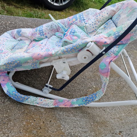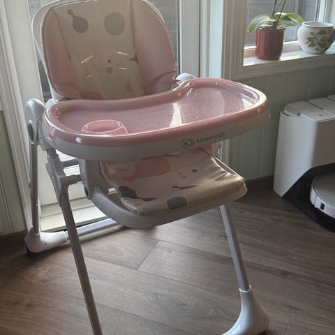 Kinderkraft barnestol med polstret sete og sikkerhetssele. Har avtakbart brett med koppesikring. Passer for barn ved måltider og aktiviteter.