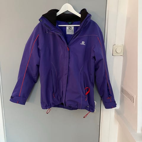 Skisett til dame fra Salomon. Jakken har mange praktiske lommer og snøskjørt. Jakken er litt slitt på venstre siden som vist på bilde. Buksen kan tilpasses i midjen og har snøskjørt ved beina. Buksen har knapper nederst i beina til justering.