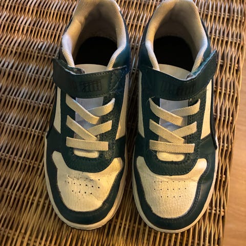 Puma Barina barnesko i størrelse 32, unisex. Skoene er hvite med svarte detaljer og har borrelås for enkel justering.