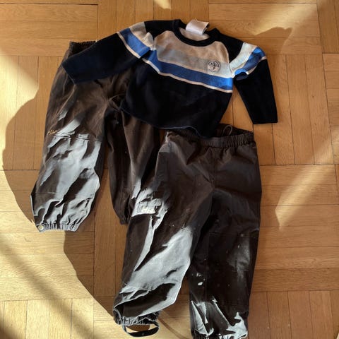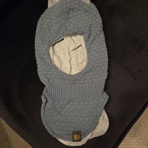 Kattnakken balaclava i ull og med innside trekk i bomull. Størrelse 1-3 år, vi brukte den i vintersesongen fra barnehagestart og ut barnehagen (1-5 år). Mørk, bringebær farge, så passer best til jente. Hel og fin på utsiden, noe lett misfarging ved pannen på innsiden av luen (ses best på første bilde). Ører i refleks-materiale.