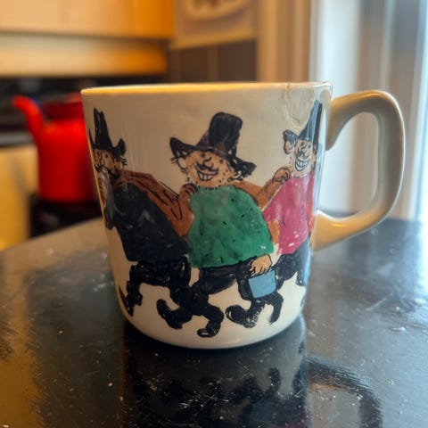 Kaffesett i 12 deler. Klassiske roser. Selges samlet. 12 kaffekopper, med asjett og tefat, samt kaffekanne, melkemugge, fløtemugge, skål til sukkerbit og t-skjeer.