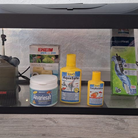 Lite akvarium (mål: 30cm høyt, bredde 25x25 cm). Alt følger med: lys, glasslokk (ikke avbildet), rensepumpe med ekstra filtersvamp, termostat, sand, en vannsugedings til å bytte vann og rense sanden, diverse tilsetninger og «medisin» for riktig vannkvalitet, skrape og en liten håv. Fiskemat til kampfisk kan fås med hvis ønskelig.