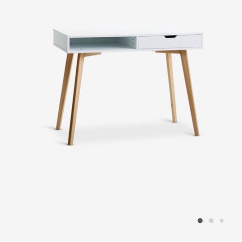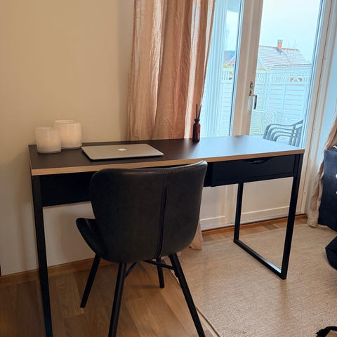 Jeg selger mitt skrivebord grunnet plassproblemer. Høy kvalitet. Som nytt. KMS Interiør. Ny pris fra leverandør med ben. 2900,-. Justerbare ben i aluminiumsfarge (15 cm). Hvit bordplate. Ingen bruksmerker. Må hentes. Trappefri adkomst.