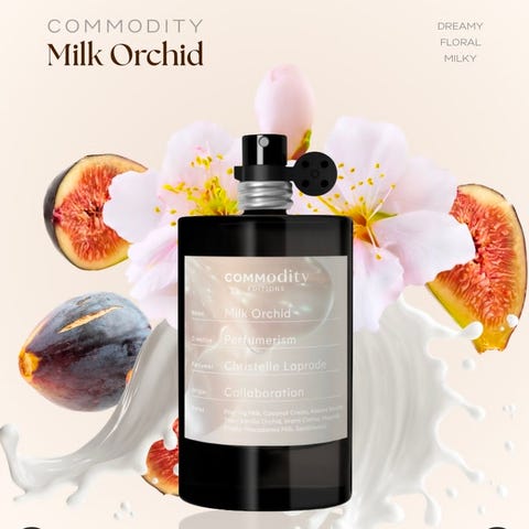 Commodity Milk Orchid er en myk og kremet gourmand der varme melkefasetter gir en lun åpning, balansert av en subtil kokosaktig rundhet og et lett fruktig preg fra fiken. I hjertet ligger en elegant vaniljeorkidé som tilfører dybde og en rolig, sensuell varme ✨🤍🥛