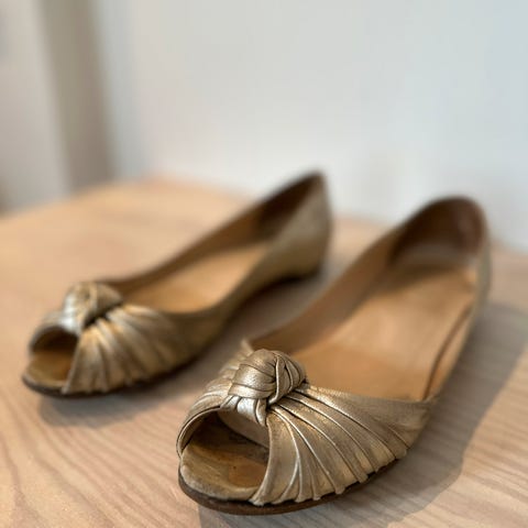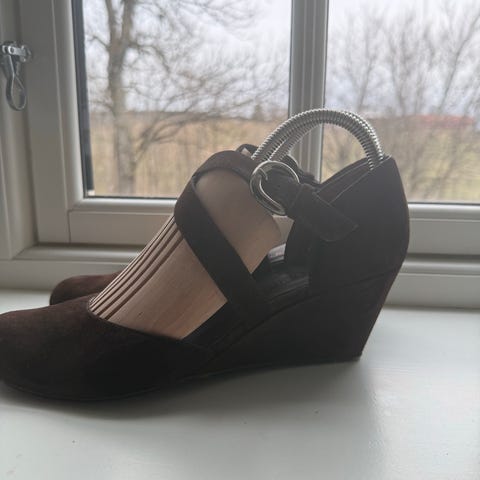Hæler i str 40 laget av brunt skinn. Skoene har en spiss tupp og utskårne detaljer på sidene. Passer til formelle anledninger eller bruk som pent fottøy.