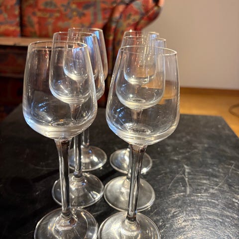 Fem små drinkglass, pent brukt.