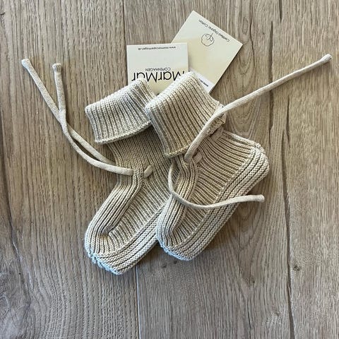 Booties eller tøfler til nyfødt, størrelse 50, fra Marmar Copenhagen. Aldri brukt, kun tatt av lappen.