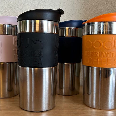 Bodum termokopp laget av rustfritt stål med svart silikon rundt midten for bedre grep.