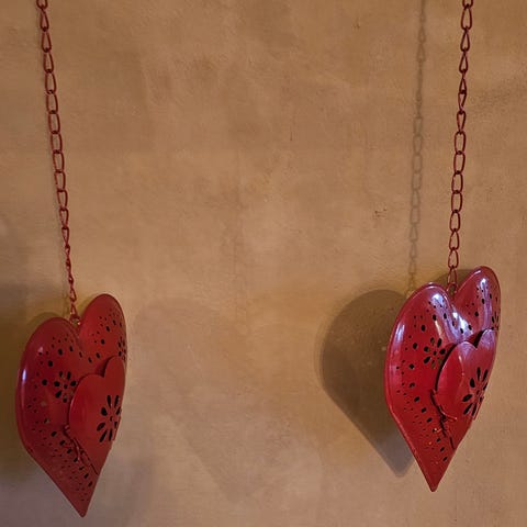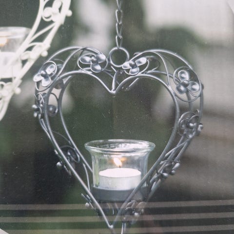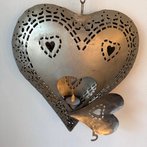 Hjerteformet dekorasjon med lysholder laget i metall. Dekorasjonen har et utskjært hjerte i midten og kan henges opp med en tilhørende kjede. Egnet for innendørs bruk som dekorativt element med plass til et lite telys.