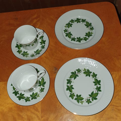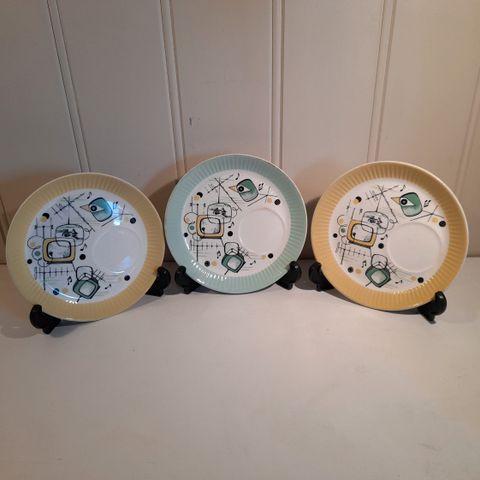 Selger 6 stk retro asjetter samlet. Kult mønster! Produsert av Freiberger Porzellan. Asjettene er i god stand uten skader i porselenet. Fine i fargen! Diameter ca 17 cm. Tipper de er fra 60-70 tallet.