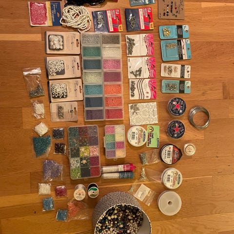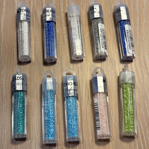 32 små glass som inneholder små smykkeperler i ulike farger. Noen av glassene er brukt, men inneholder fortsatt flere tusen perler.