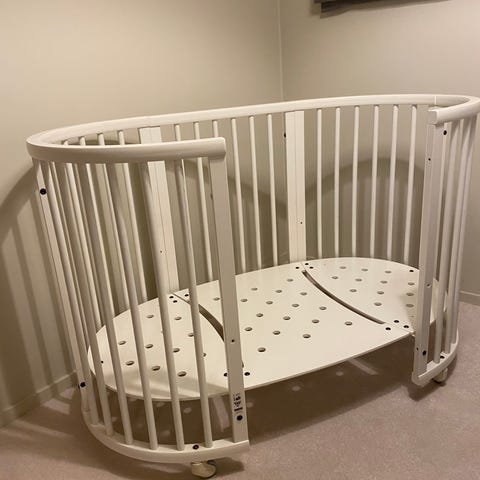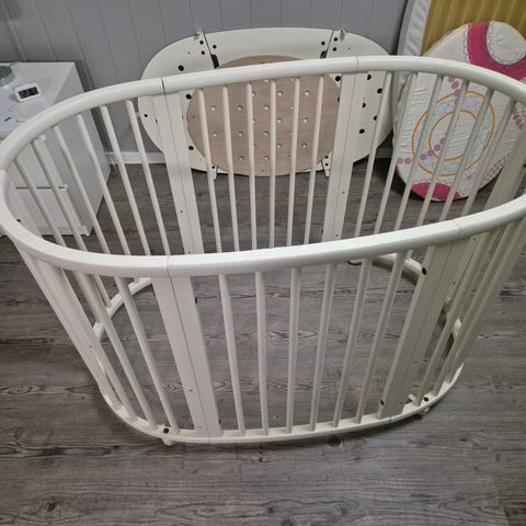 Brukt stokke sprinkelseng med madrass, formsydd laken og sengekant selges kr 2000,-. Eit av hjula er defekt. Dette kan kjøpes nytt om ein ønsker, men kan fint brukes uten. Er lagret i deler slik som på bildet.