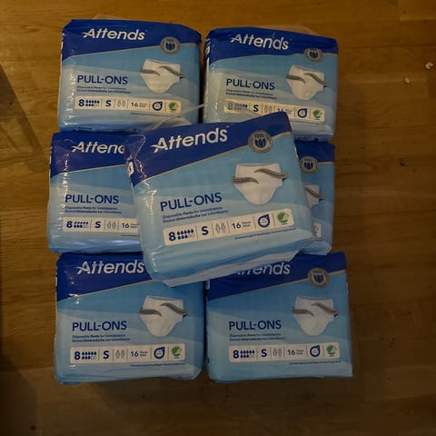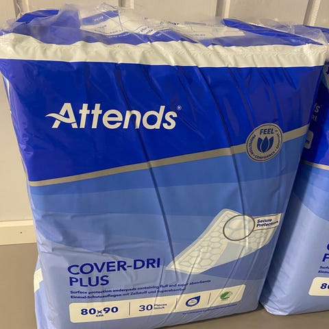 Attends Cover-Dri Plus inkontinensbind med størrelse 80x90 cm. 15 stk igjen. Jeg har brukt de til valpebinge.