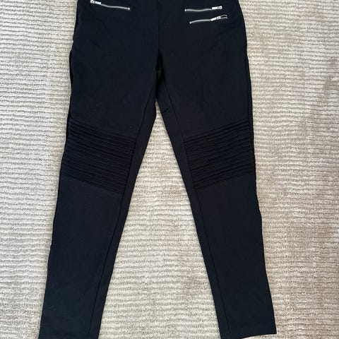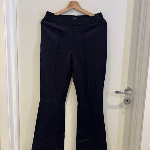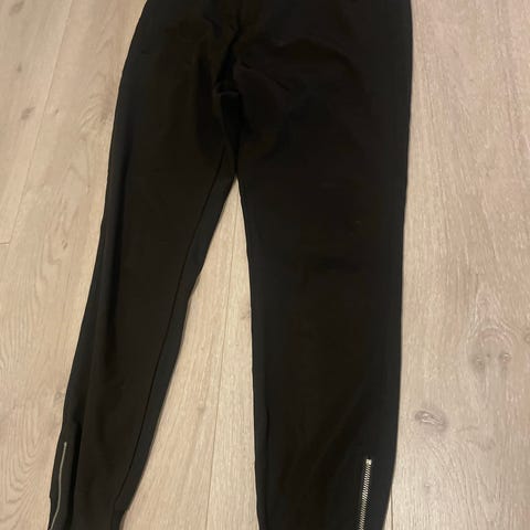 Selger stilige svarte bukser fra Mango med hvit stripe langs siden.