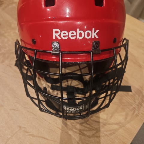 Reebok ishockeyhjelm i hvit farge. Hjelmen er designet for ishockey og har justerbare stropper for sikker passform. Str 51-56 cm. 3K
