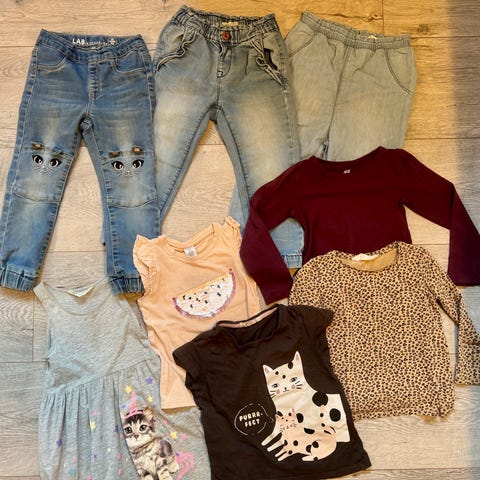 4 hettegensere, 3 gensere, 1 body, 2 nattiser og 1 nattrøye, 1 finskjorte, 3 bukser, 6 tskjorter. Noe 98 og noe i 98/104. Men alt passet samtidig.