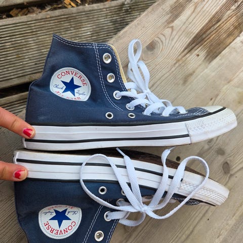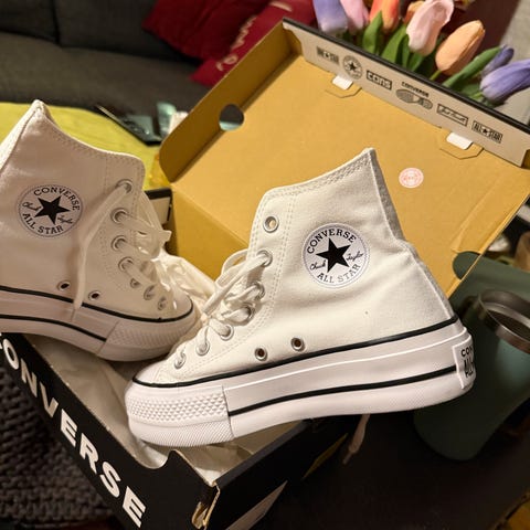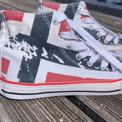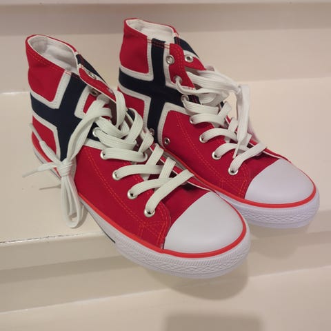 Sko i Converse-stil med norske flagg. Kjøpt på Russeservice. Str 36. Se på siste bilde for litt misfarging på utsiden av sko.
