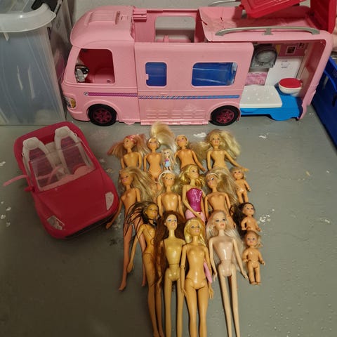 Stor barbiepakke selges! Pakken inkluderer det meste som hører til et barbieliv. Blant annet bil, sammenleggbart soverom m/ kjøkken, sammenleggbart klesskap, telt m/ feltstoler, møbler til et barne -og babyrom ( + noen barn), sminkebord etc. (ellers alt på bildene). Litt barbieklær, noen sko og litt småting. 11 dukker inkl. en gravid dukke med baby i magen og gråtelyd når man presser på smykket. Bør hentes.