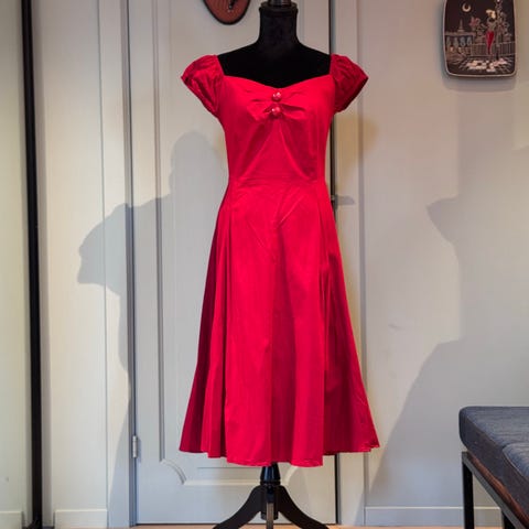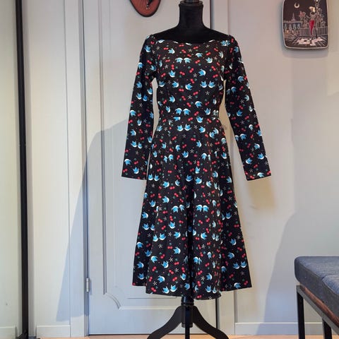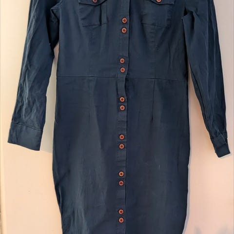 Thelma dungarees i 70-talls hippie stil fra det britiske retro remake merket Collectif Vintage. Str L. Pent brukt ett par ganger, men er akkurat bittelitt for kort i beina til meg som er 174cm høy. Passer ellers fint til str 42. Se mål for best mulig fit. Bomull 74% polyester 24% elastane 2%, mykt stoff med god stretch. Regulerbare seler, baklommer og knepping i begge sidene. Stor 70’s sleng. Høyt liv.