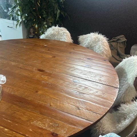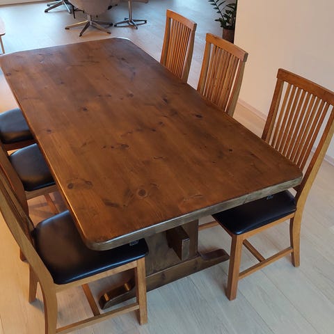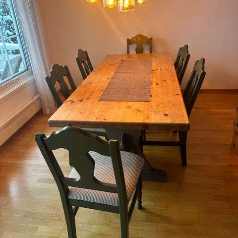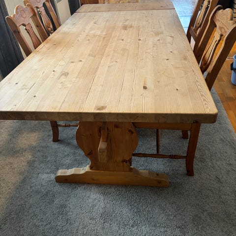 Rund spisestue 125 cm diameter i heltre furu med 8 stoler