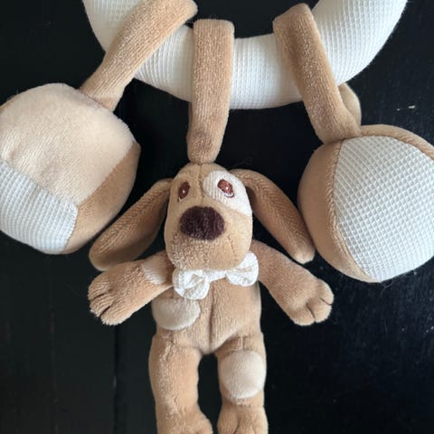 Se bilder for leker og ringer til oppheng som følger med. Alt er helt og rent.