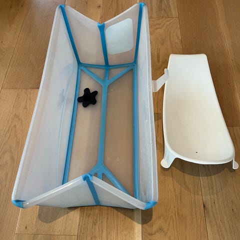 Stokke Flexi Bath babybadekar med stativ. Badekaret har en hvit plastform for babyen og et sammenleggbart stativ i metall. Designet for enkel bruk og oppbevaring, egnet for spedbarn.