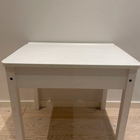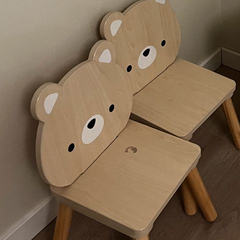 Skrivebord fra Plantoys med to stoler. Bordplaten er slitt og bordbeina og hyllen er tegnet på. Stolene har vært dekket med klistremerker. Det kan brukes som det er, eller pusses opp. Min plan var sistnevnte, men jeg har andre prosjekter som går foran. Ny pris rundt 2500 kroner.