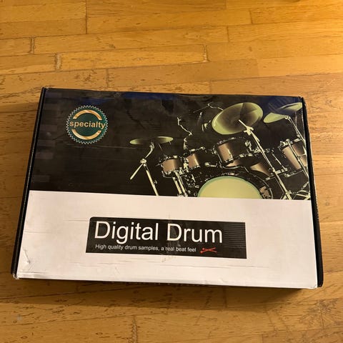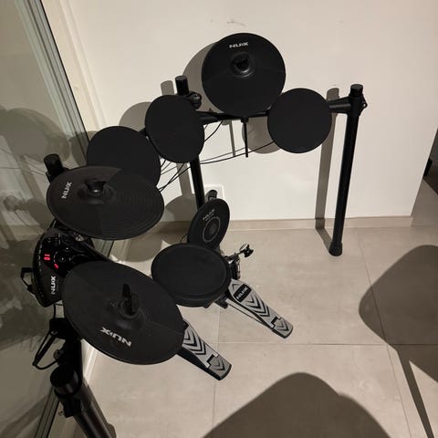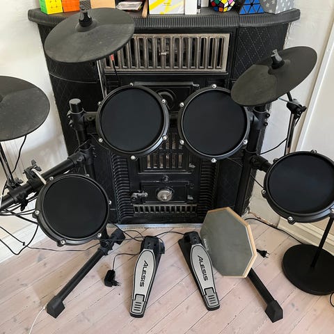 Alesis DM6 elektronisk trommesett med flere trommepads og pedal. Trommesettet inkluderer en kontrollenhet med ulike innstillinger for trommelyder og effekter. Pedalene er utformet for å simulere hi-hat og basstromme. Trommepadsene har gummioverflate for demping av lyd. Settet leveres med trommestikker.
