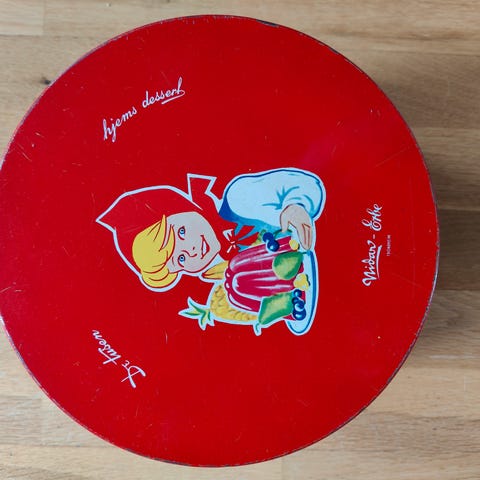 Vintage kakeboks med Disney-motiv fra Tornerose. Boksen er dekorert med scener og karakterer fra den klassiske Disney-filmen, inkludert prinsesse Aurora og prins Philip.