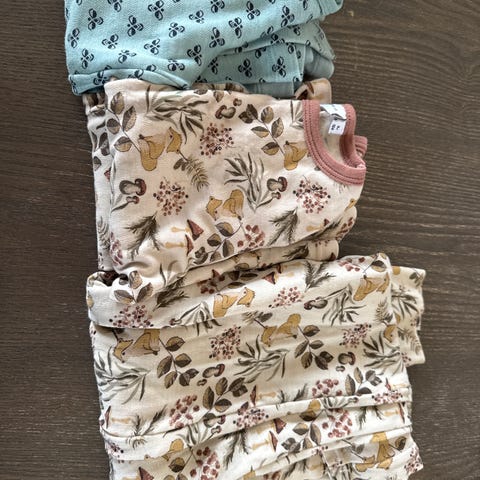 Gullkorn Design Villette joggedresser i str. 116. Er lyse grønt mønstret og et gult. Ingen videre slitasje foruten en liten flekk på baksiden av den gule buksen (se bilde).