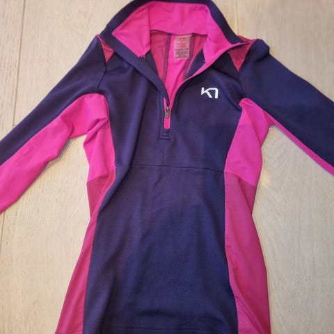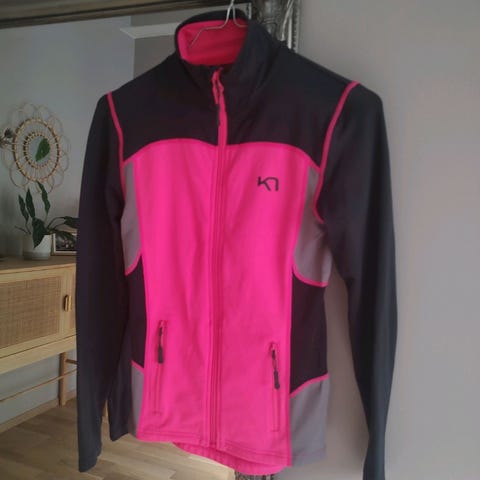Kari Traa fleece treningsjakke for kvinner i størrelse XS. Jakken har hel glidelås og er mørke blå med lyseblå detaljer. Egnet for ulike typer trening og fysisk aktivitet.