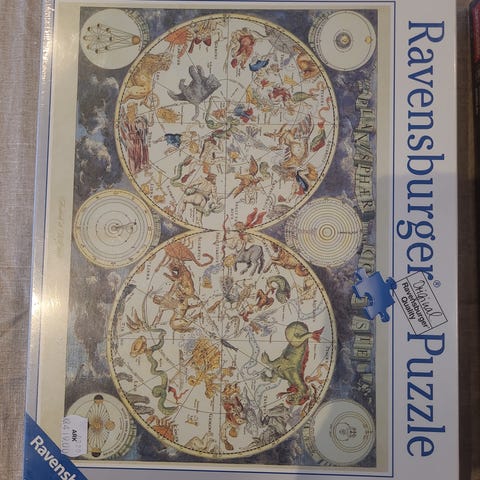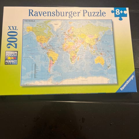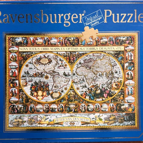 Ravensburger Verdenskart puslespill med 9000 biter. Puslespillet viser et detaljert verdenskart med dekorative elementer rundt kartet. Egnet for voksne og puslespillentusiaster.