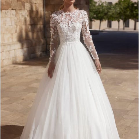Dette er en luksuriøs prinsesse kjole med utsøkte blondedetaljer i overdelen og et vakkert, fyldig skjørt i flere lag lett tyll som gir et elegant fall. Kjolen har stropper og en flatterende utringning som gir både komfort og støtte, samtidig som silhuetten er feminin og eksklusiv. Det elegante slepet gir et majestetisk uttrykk perfekt for vielse, fotografering og bryllupsfest.