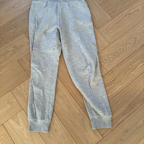 H&M joggebukse i størrelse 170 for barn, unisex. Buksen er grå og laget av mykt materiale. Den har elastisk midje med snøring og elastiske mansjetter ved bena.