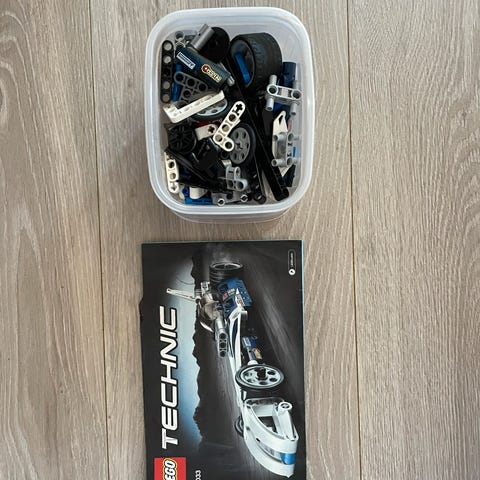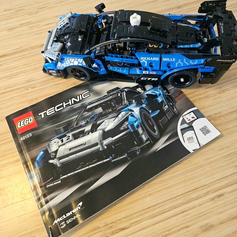 Opptrekkbar LEGO Technic bilmodell i grønn farge. Modellen har detaljer som etterligner en sportsbil, inkludert sorte og hvite striper, og røde felger. Mangler speilet på passasjersiden.