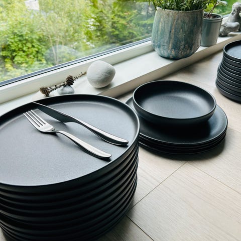 Ett lite hakk i ene frokosttallerken, ellers er settet i god stand med vanlige bruksmerker.