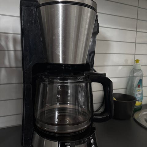 kaffetrakter med termokopp og glasskanne. Kaffetrakteren har en digital skjerm og flere kontrollknapper. Termokoppen er i rustfritt stål, og glasskannen har en kapasitet for flere kopper kaffe. Produktet er i svart og sølvfarget design.